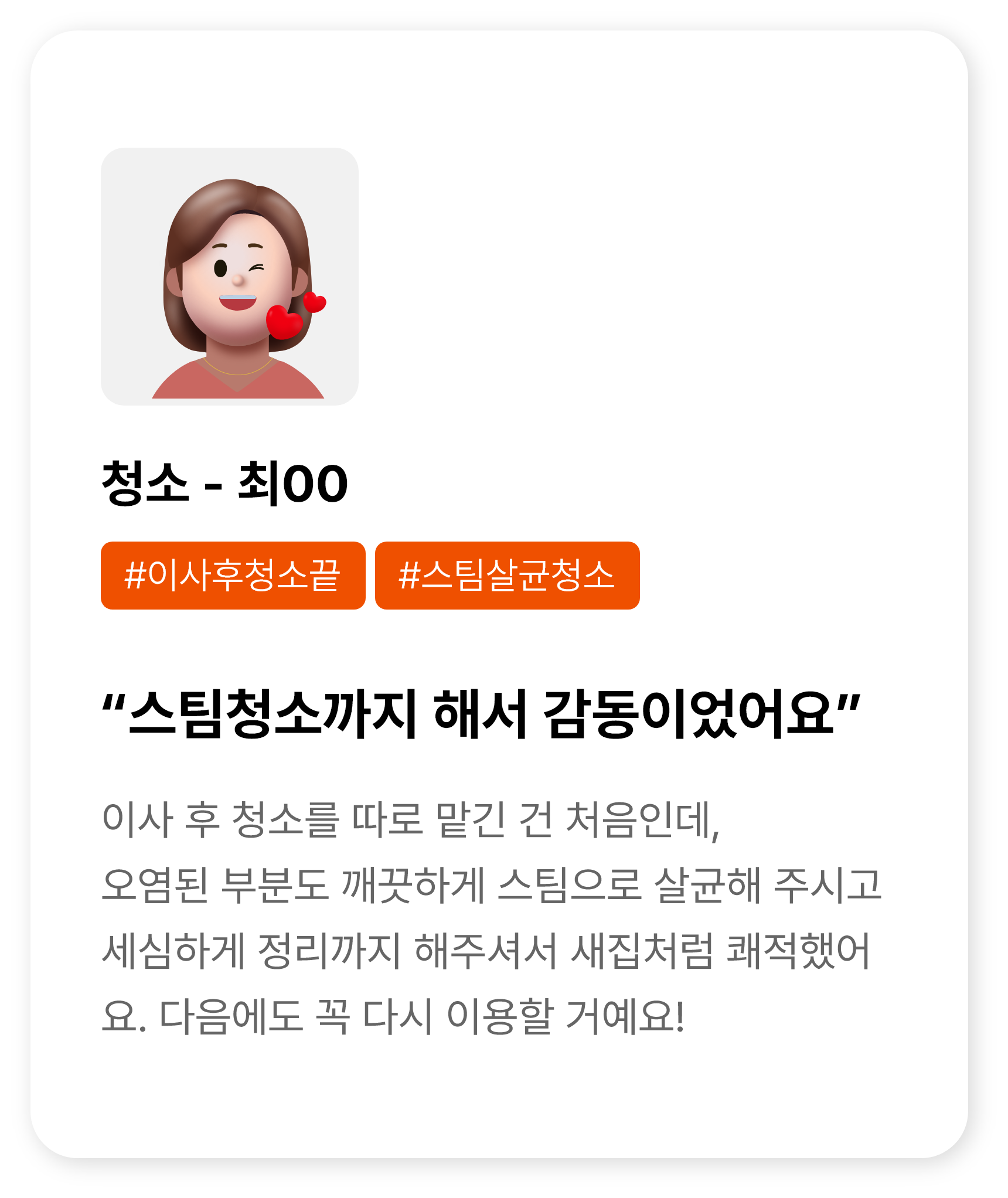 스팀청소 서비스까지 ONE‑STOP 솔루션을 제공합니다.
